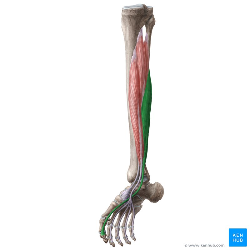 | Function | Metatarsophalangeal and interphalangeal joint 1: Toe flexion; Talocrural joint: Foot plantar flexion; Subtalar joint: Foot inversion |
